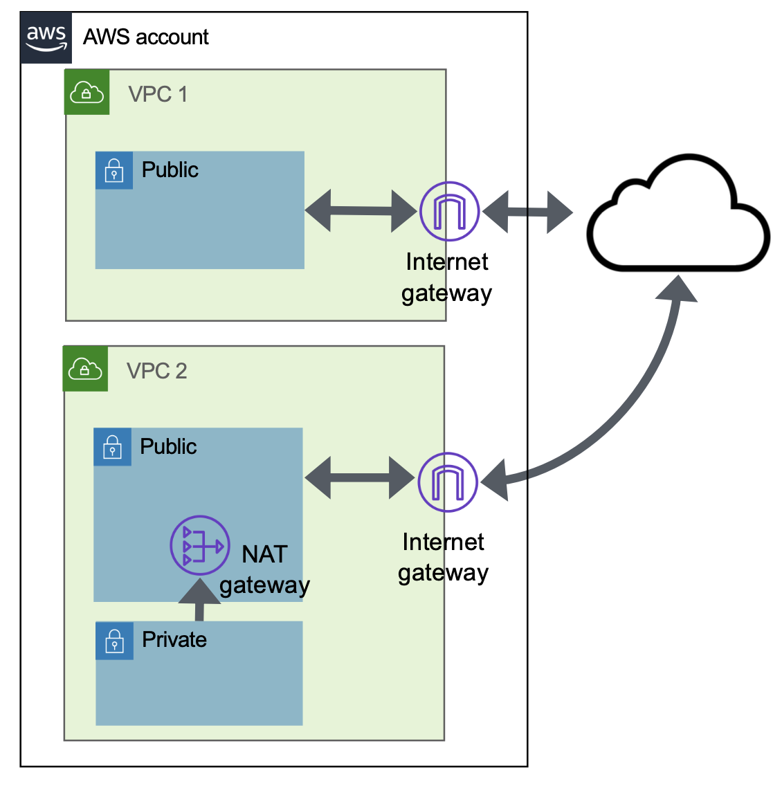 - The NAT gateway can be public (access to the internet) or private (access to other VPCs)