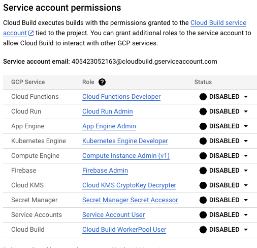 Ο Λογαριασμός Υπηρεσίας έχει το πεδίο cloud-platform, επομένως μπορεί να χρησιμοποιήσει όλα τα δικαιώματα. Αν δεν καθοριστεί SA (όπως όταν γίνεται υποβολή) θα χρησιμοποιηθεί ο προεπιλεγμένος SA <proj-number>@cloudbuild.gserviceaccount.com.