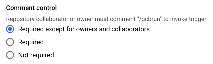 Όταν το trigger είναι PR επειδή ο καθένας μπορεί να εκτελεί PRs σε δημόσια αποθετήρια θα ήταν πολύ επικίνδυνο να επιτρέπεται η εκτέλεση του trigger με οποιοδήποτε PR. Επομένως, από προεπιλογή, η εκτέλεση θα είναι αυτόματη μόνο για τους ιδιοκτήτες και τους συνεργάτες, και για να εκτελέσει το trigger με PR άλλων χρηστών, ένας ιδιοκτήτης ή συνεργάτης πρέπει να σχολιάσει /gcbrun.
