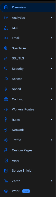 En cada TLD configurado en Cloudflare hay algunas configuraciones y servicios generales que se pueden configurar. En esta página vamos a analizar las configuraciones relacionadas con la seguridad de cada sección: