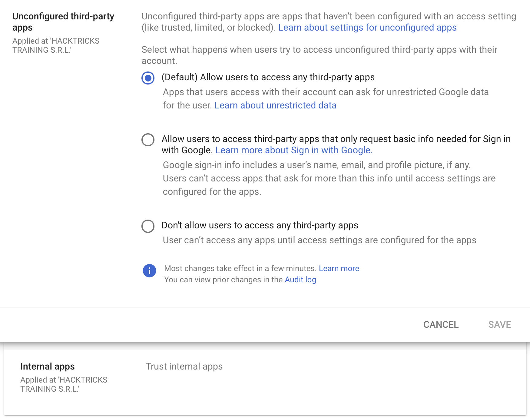 Per impostazione predefinita è configurato che qualsiasi utente all’interno di un’organizzazione Workspace can accecpt any OAuth app with any permissions, ma è possibile limitarle solo alle app che richiedono le informazioni di base necessarie per Sign in with Google o non consentire alcuna third-party app.