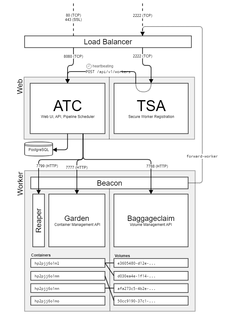 - Baggageclaim: To jest API zarządzania wolumenami, zazwyczaj uruchamiane na porcie 7788 przez HTTP.