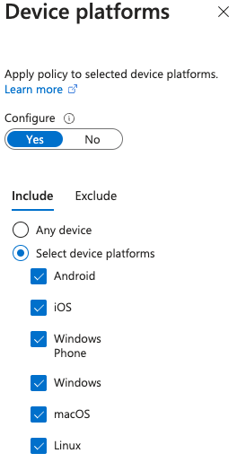 Można ustawić warunek oparty na platformie urządzenia (Android, iOS, Windows, macOS…), jednak opiera się to na user-agent, więc łatwo to obejść. Nawet jeśli wszystkie opcje będą wymuszać MFA, jeśli użyjesz user-agent, który nie jest rozpoznawany, będziesz w stanie obejść MFA lub block: