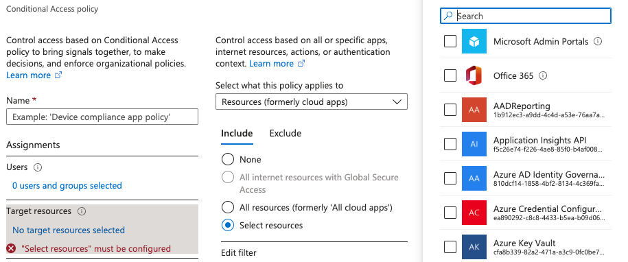 Przy konfigurowaniu conditional access policy trzeba określić użytkowników objętych oraz docelowe zasoby (np. all cloud apps).