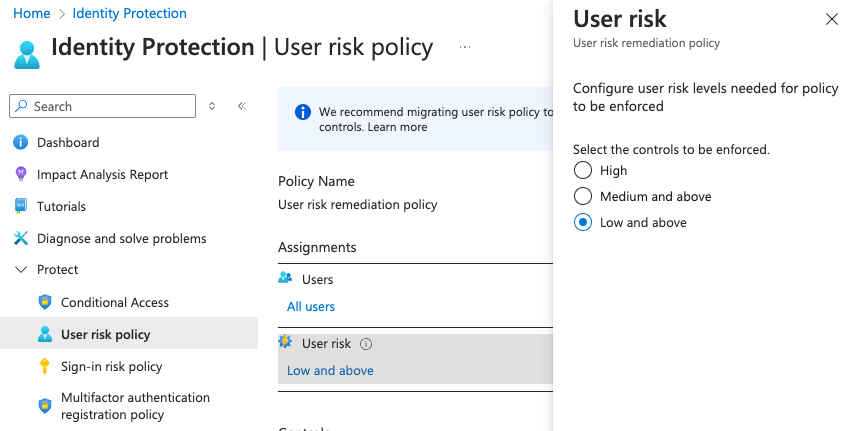 Administrator może skonfigurować ją tak, by blokowała próby, gdy ryzyko jest “Low and above”, “Medium and above” lub “High”. Jednak domyślnie jest całkowicie wyłączona: