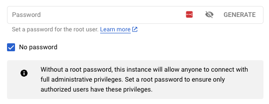 W konsoli internetowej Cloud SQL użytkownik może ustawić hasło bazy danych, istnieje również funkcja generowania, ale co najważniejsze, MySQL pozwala pozostawić puste hasło, a wszystkie z nich pozwalają ustawić jako hasło tylko znak “a”: