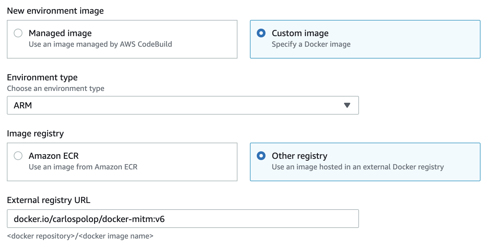 "type": "LINUX_CONTAINER", // Use "ARM_CONTAINER" to run docker-mitm ARM