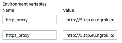http_proxyvehttps_proxyenv değişkenlerini tcp ngrok’unuza işaret edecek şekilde ekleyin: