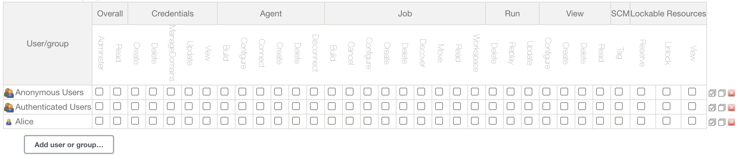- Matrix-based security:你可以在一个表格中配置 谁可以做什么。每一 列 代表一个 permission。每一 行 代表一个 user 或 group/role。这包括一个特殊用户 ‘anonymous’,代表 未认证用户,以及 ‘authenticated’,代表 所有已认证用户。