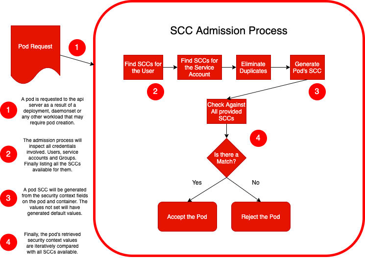 通过配置 SCC,管理员可以确保 pod 以适当的安全隔离和访问控制级别运行,从而降低集群内安全漏洞或未经授权访问的风险。